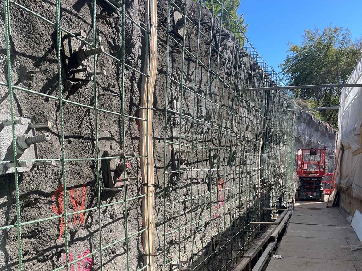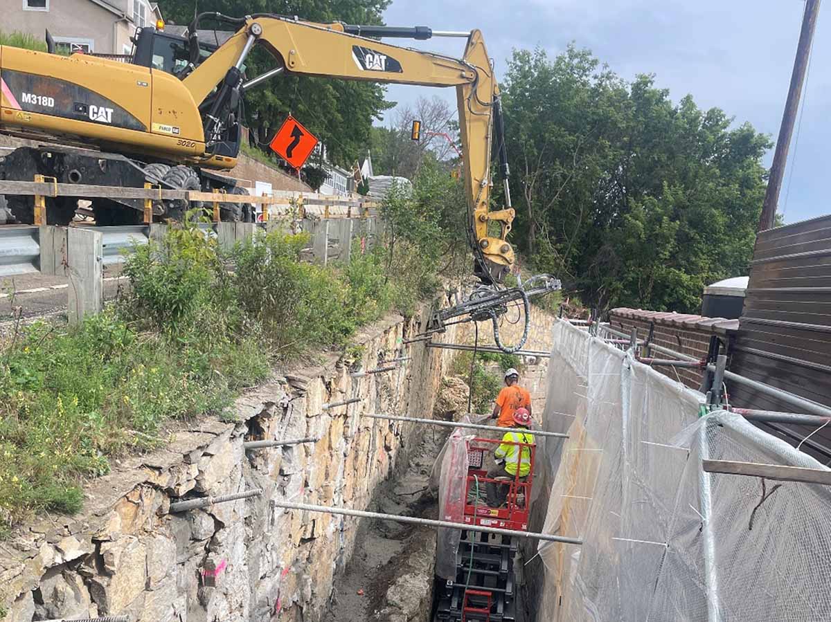 Wall R-47-40 showcased innovative construction techniques, including a soil nail wall system installed in extremely limited space using specialized equipment. The team executed the work with precision, protecting nearby structures and utilities while delivering a clean, high-quality finish designed to blend seamlessly with the natural bluff landscape.