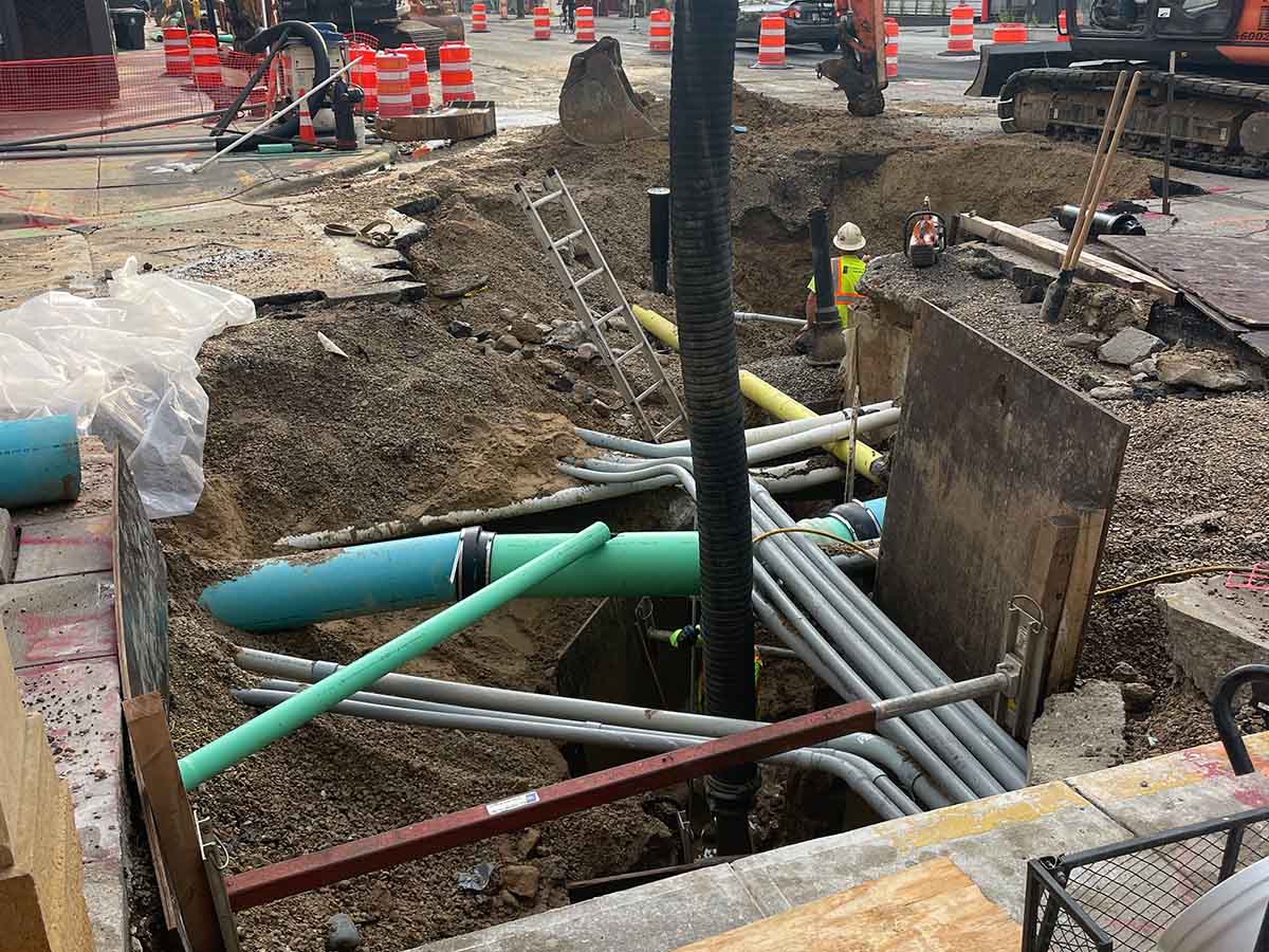 Most of the duct package was a 12-duct configuration, measuring approximately 2.25 feet wide by 3 feet deep. Some sections were even larger, using 15-duct configurations. The KL team wove the duct package over, under, and around existing utilities beneath the streets of downtown Madison. KL also worked with several utility providers to relocate their facilities and make room for the new duct package. The duct package conflicted with a few areas of water main and laterals that KL helped redesign for the City. Permitting the water main and laterals was also coordinated with the City project.